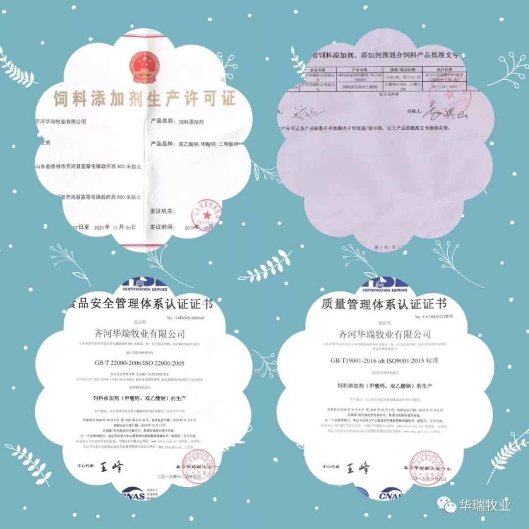 3.甲酸钙饲料级的生产资质。上面有说过甲酸钙分工业级和饲料级,工业级很多中小型企业都在生产。但是,饲料级并不是随随便便就能生产的,华瑞牧业甲酸钙饲料级的生产线及相关人员都是通过严格的考核才获得饲料级生产许可证,ISO9000/ISO22000认证及第三方检测。