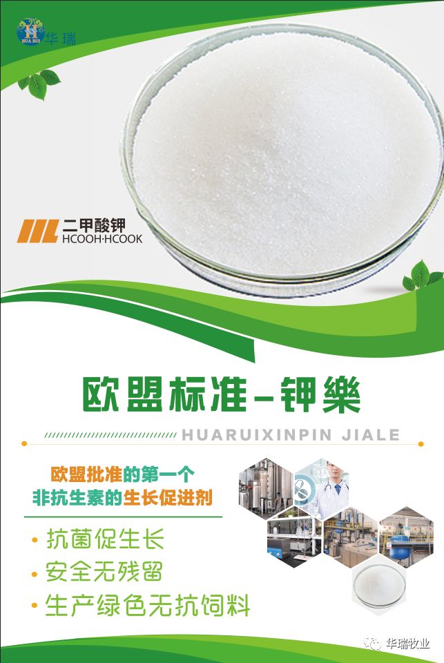 随着对滥用抗生素危害和细菌耐药性的认识,二甲酸钾成为现代化养殖业可持续发展的理想解决方案。钾乐-二甲酸钾 作为一种具有动物促生长作用的环保添加剂,可完全替代抗生素在日粮中使用。华瑞牧业公司生产的钾乐-二甲酸钾就是既克服甲酸的不足又利用甲酸的优势。由于其高效缓释的酸化效果,同时有极强的抑菌杀菌作用,钾乐-二甲酸钾性能优于普通复合型酸化剂。通过降低胃肠道pH值,调控消化道微生物区系结构,减少大肠杆菌和沙门氏菌等致病菌数量,抑制有害菌繁殖,有利于有益菌的增殖,从而增加了动物体对能量